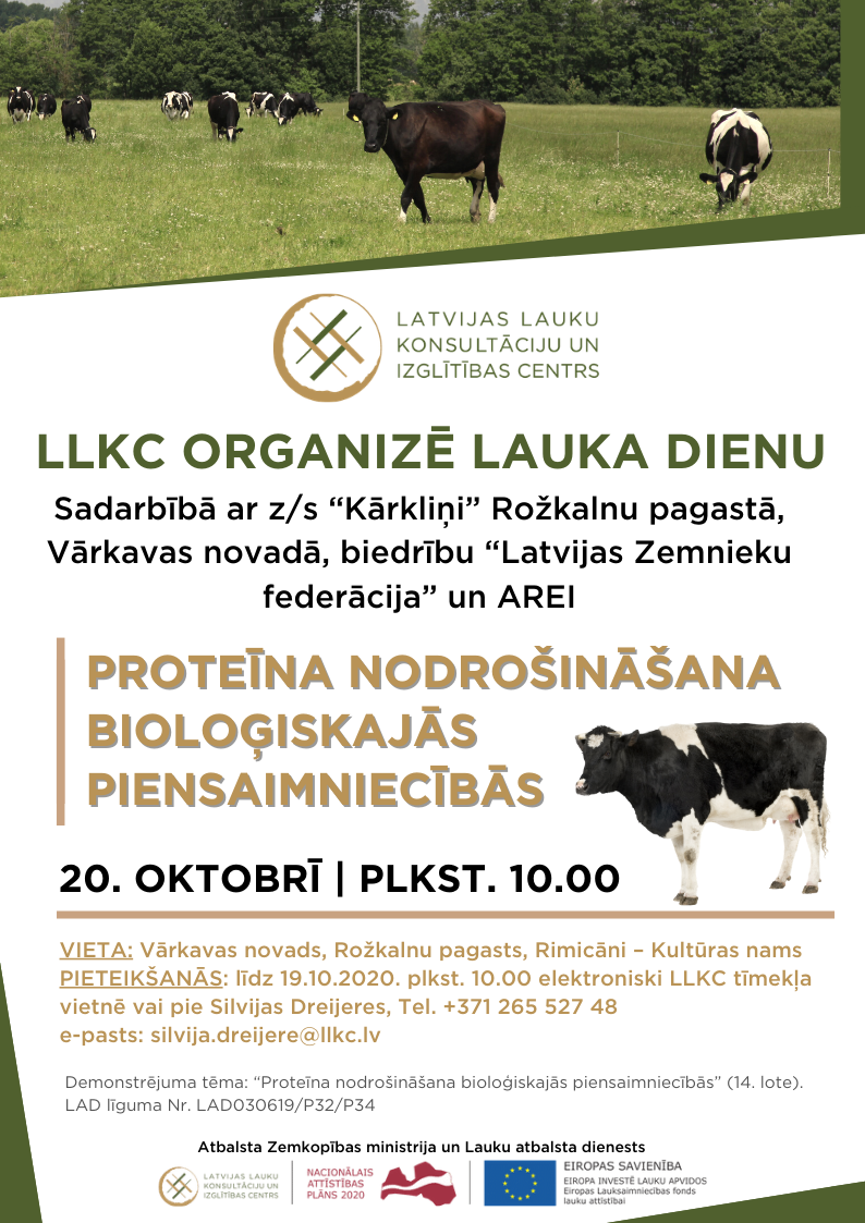 Latvijas Lauku un konsultāciju centrs (LLKC) aicina uz Lauka dienu bioloģiskajā piena lopkopības saimniecībā par govju ēdināšanu tranzītperiodā, kā arī par negatīvas enerģijas bilances ietekmi uz govs veselību. Demonstrējums tiek veikts z/s “Kārkliņi” Rožkalnu pagastā, Vārkavas novadā.