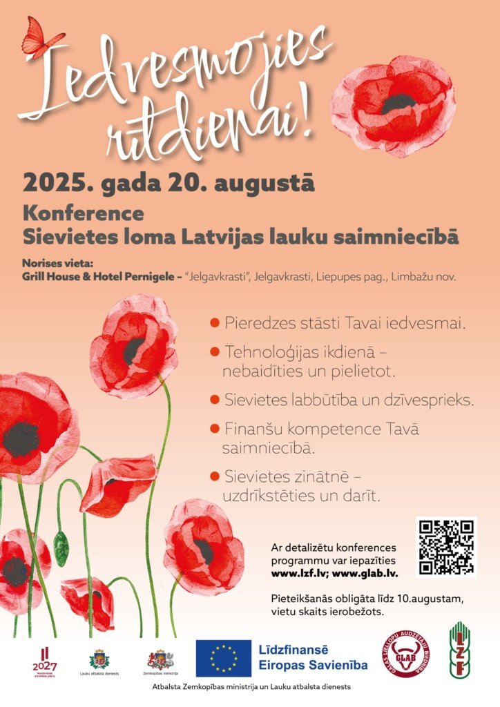 Konferences mērķis ir iedvesmot, stiprināt un atbalstīt Latvijas sievietes – lauku uzņēmējas, lauksaimnieces un visas tās, kuras ikdienā rūpējas par lauku dzīves attīstību. Šajā pasākumā aicinām piedalīties ikvienu sievieti, neatkarīgi no vecuma, pieredzes vai lauksaimniecības nozares, kurā tā darbojas.