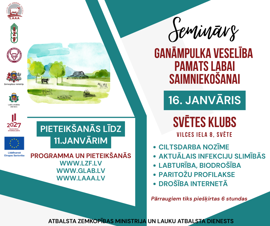 Biedrība “Latvijas Zemnieku federācija” kopā ar biedrībām “Gaļas liellopu audzētāju biedrība” un “Latvijas aitu audzētāju asociācija” aicina uz semināru lopkopjiem (atgremotāju sugām) “Ganāmpulka veselība – pamats labai saimniekošanai”, kurā kopīgi pārrunāsim, kā ar vienkāršiem un pārbaudītiem paņēmieniem rūpēties par savu ganāmpulku, lai dzīvnieki būtu veseli, saimniecība ienesīga un darbs vieglāks.
